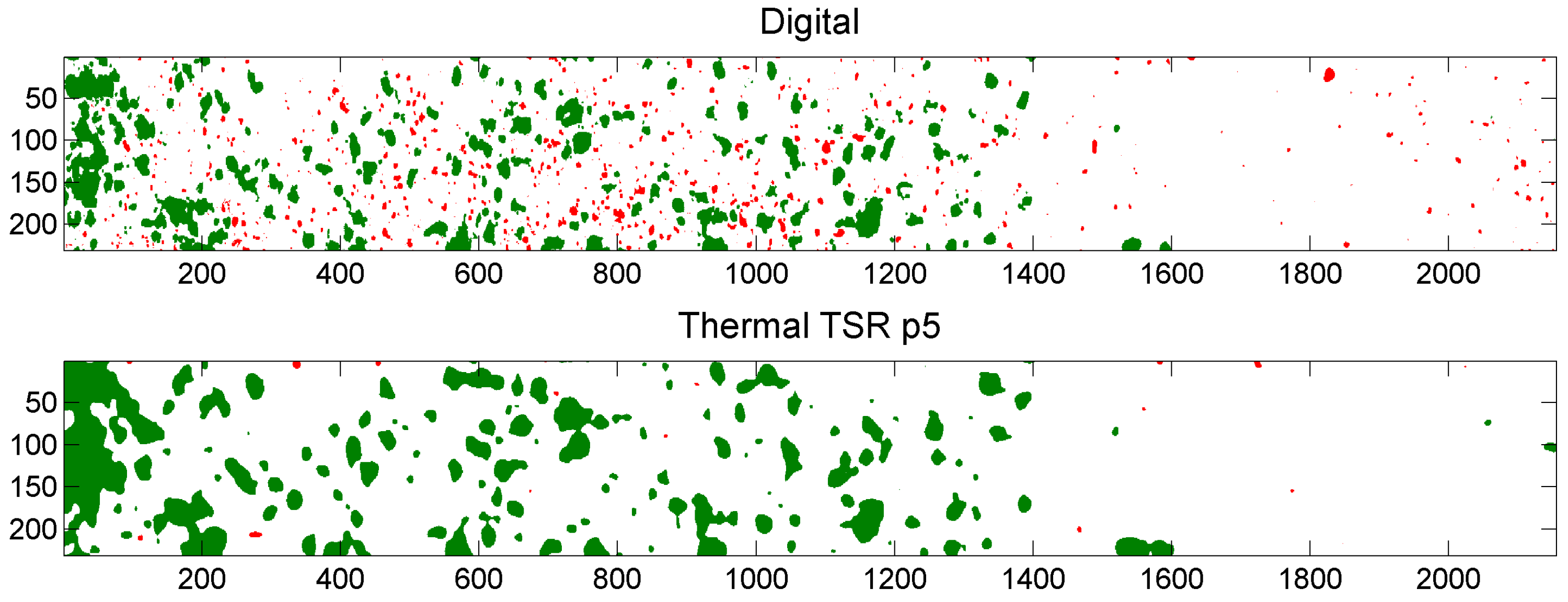Binarized digital image (top); and binarized thermal output image “thermal signal reconstruction (TSR) p5” (bottom). Coordinates are shown in pixels. Particles that occur in both images are shown in green. Particles that occur only in the digital image or only in the thermal output image are shown in red in respectively the top image and the bottom image.