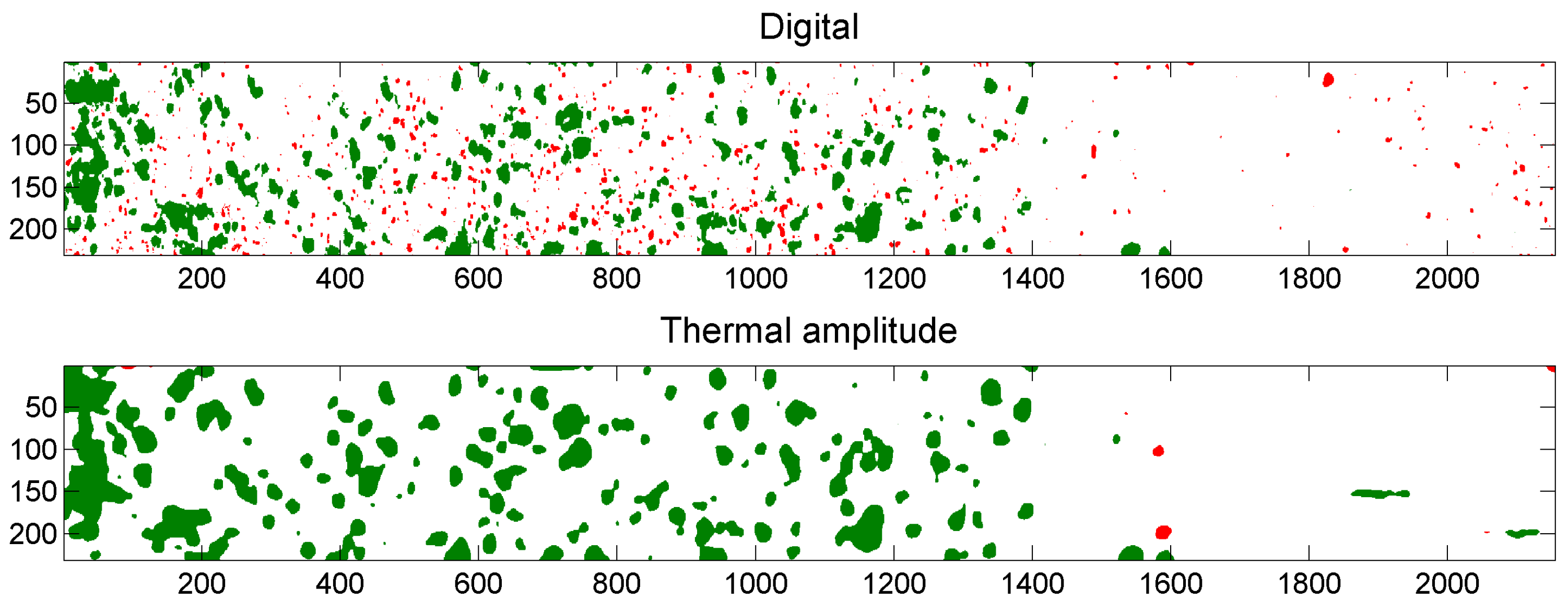 Binarized digital image (top); and binarized thermal output image “amplitude” (bottom). Coordinates are shown in pixels. Particles that occur in both images are shown in green. Particles that occur only in the digital image or only in the thermal output image are shown in red in respectively the top image and the bottom image.