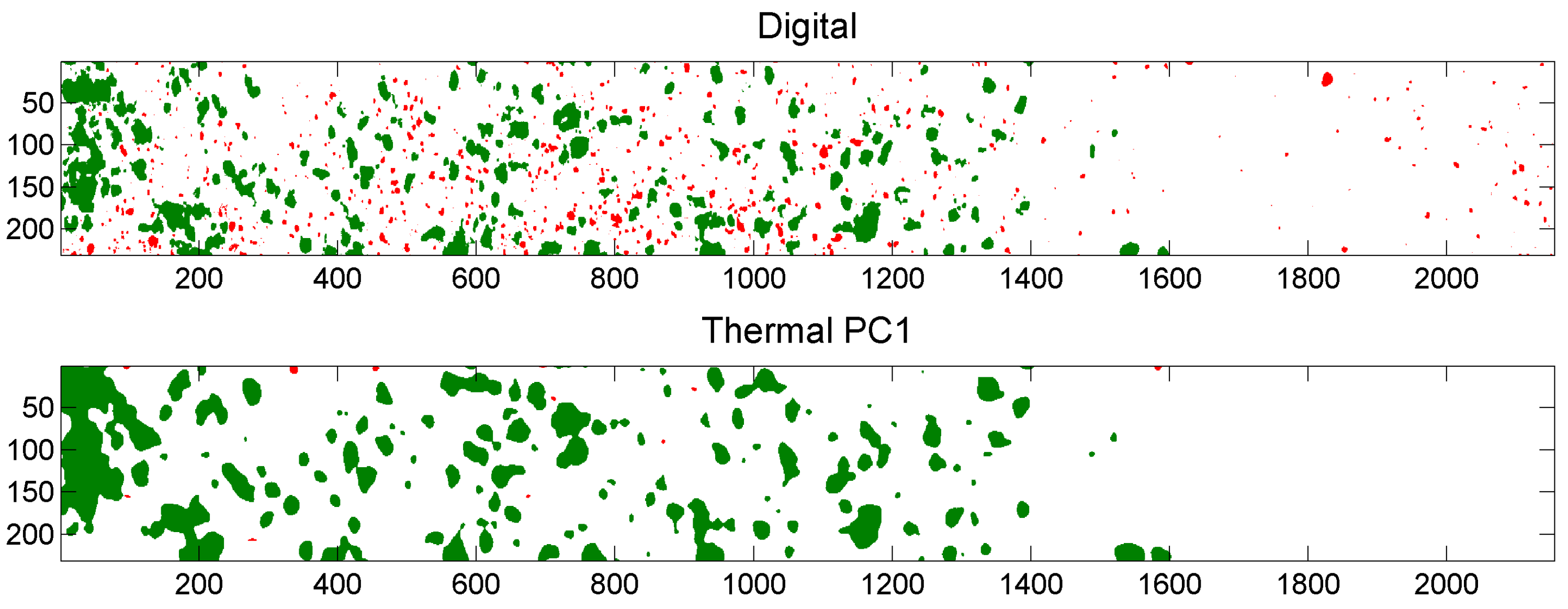 Binarized digital image (top); and binarized thermal output image “PC1” (bottom). Coordinates are shown in pixels. Particles that occur in both images are shown in green. Particles that occur only in the digital image or only in the thermal output image are shown in red in respectively the top image and the bottom image.