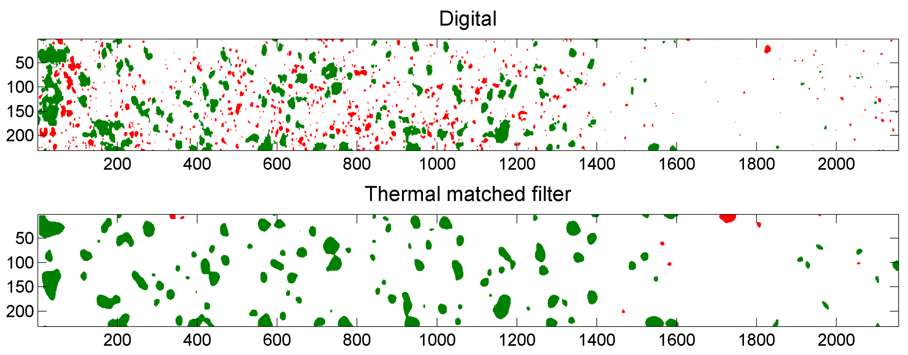 Binarized digital image (top); and binarized thermal output image “matched filter” (bottom). Coordinates are shown in pixels. Particles that occur in both images are shown in green. Particles that occur only in the digital image or only in the thermal output image are shown in red in respectively the top image and the bottom image.
