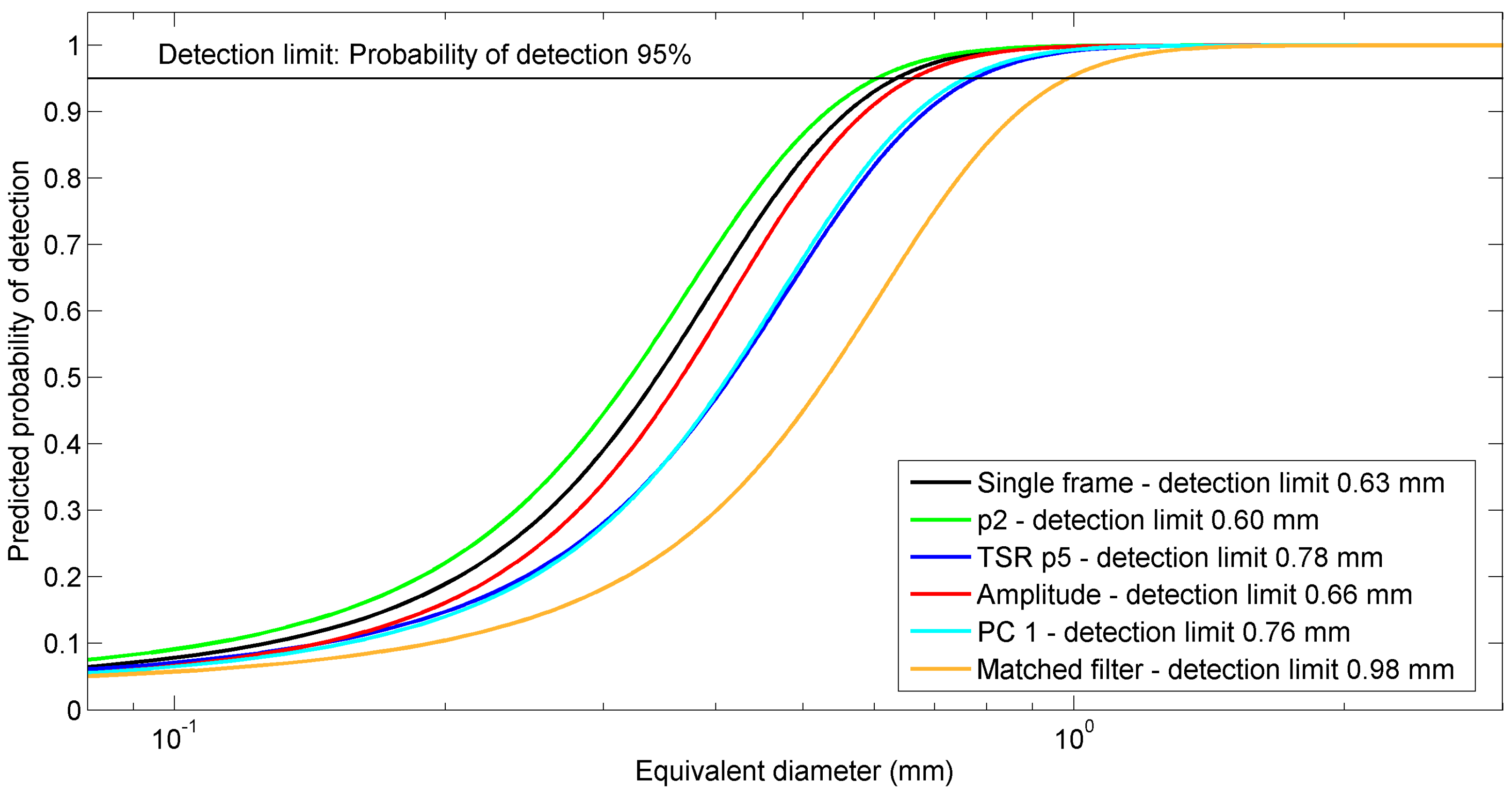 Predicted probability of detection as a function of the equivalent diameter for six thermal output images “single frame”, “p2”, “TSR p5”, “amplitude”, “PC1” and “matched filter”. A logarithmic scale is used for the x-axis. The detection limit is defined as the equivalent diameter at which the probability of detection is equal to 95%. The detection limit for each processing method is reported in the legend.