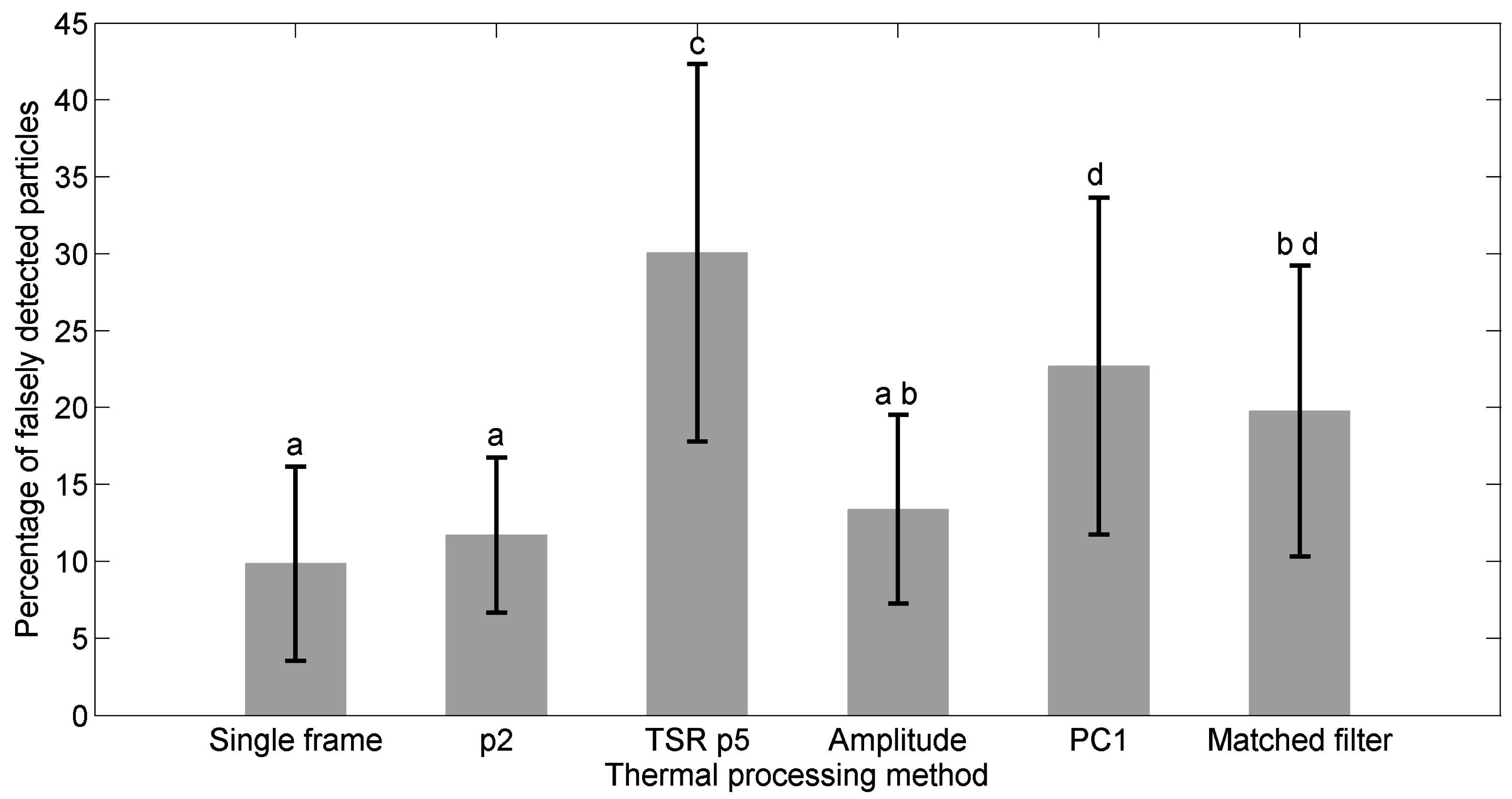 Mean percentage of falsely-detected particles for the six thermal output images. The error bars represent one standard deviation. A Tukey–Kramer multiple comparison test with significance level α = 0.05 was performed, and significant differences are reported in the plot.