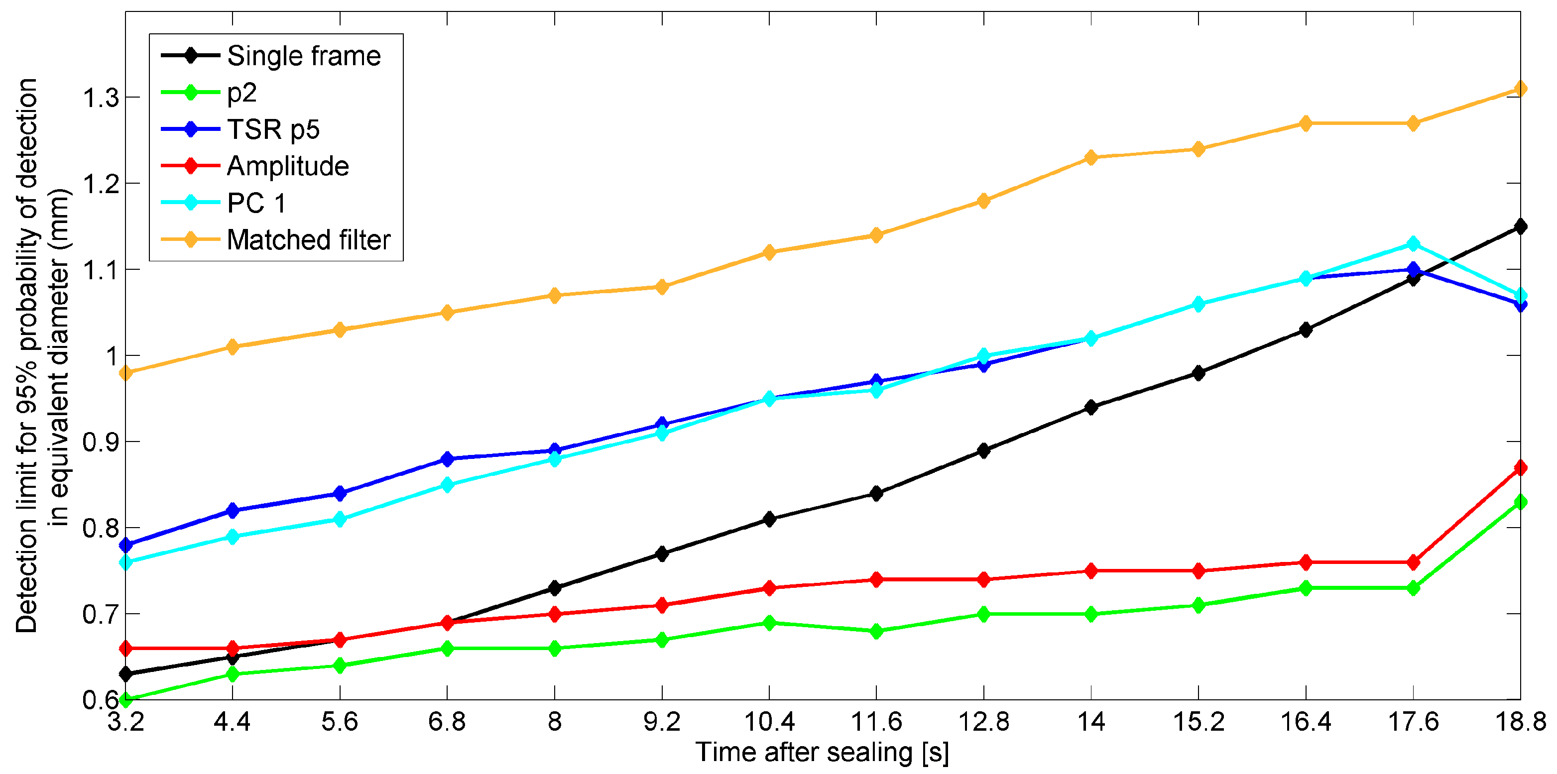 It is important to note that the detection performance of the “single frame” method depends strongly on how fast after thermal excitation this single frame can be acquired. This increase is less pronounced for the “p2” and “amplitude” methods. The detection limit of the “p2” method is lower than that of the single frame method for all recording start times. The detection limits of “amplitude”, “TSR p5” and “PC1” decrease below that of the single frame method at recording start times of, respectively, 6.8 s, 18.8 s and 18.8 s. The detection limit of the “matched filter” method is highest for all recording start times. The percentage of falsely-detected particles of the “single frame” method is also highly influenced by the recording time. The percentage of falsely-detected particles was found to be significantly higher than that of the “p2” method for recording start times from 6.8 s–18.8 s after sealing, than that of the “p1” method for recording start times from 14 s–18.8 s after sealing and than that of the “matched filter” method for a recording start time of 18.8 s after sealing.