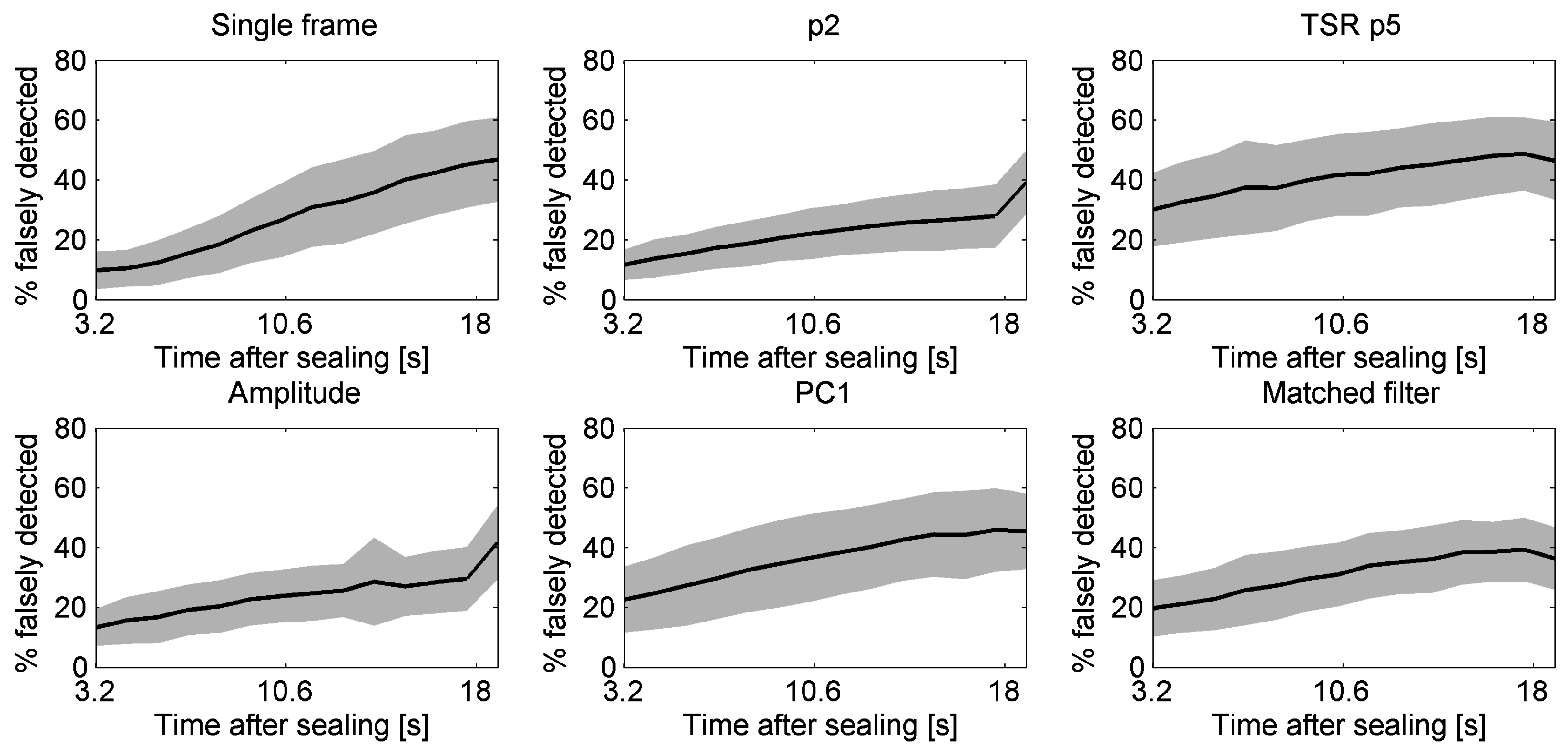 Figure 14 shows the percentage of falsely-detected particles as a function of the recording start time after sealing. The increase in the percentage of falsely-detected particles is less pronounced for the “p2” and “amplitude” methods than for the “single frame” method. The “TSR p5” method results in a large percentage of falsely-detected particles for all recording start times. An ANOVA procedure as described in Section 4.4.3 was performed at each recording start time to detect significant differences (α = 0.05) between the methods. The percentage of falsely-detected particles of the “single frame” method was found to be significantly higher than that of the “p2” method for recording start times from 14 s–18.8 s, than that of the “amplitude” method for recording start times from 15.2 s–18.8 s and than that of the “matched filter” method for a recording start time of 18.8 s. The percentage of falsely-detected particles of the “single frame” method is not significantly higher than that of the “TSR p5” method and the “PC1” method for any of the recording start times considered.