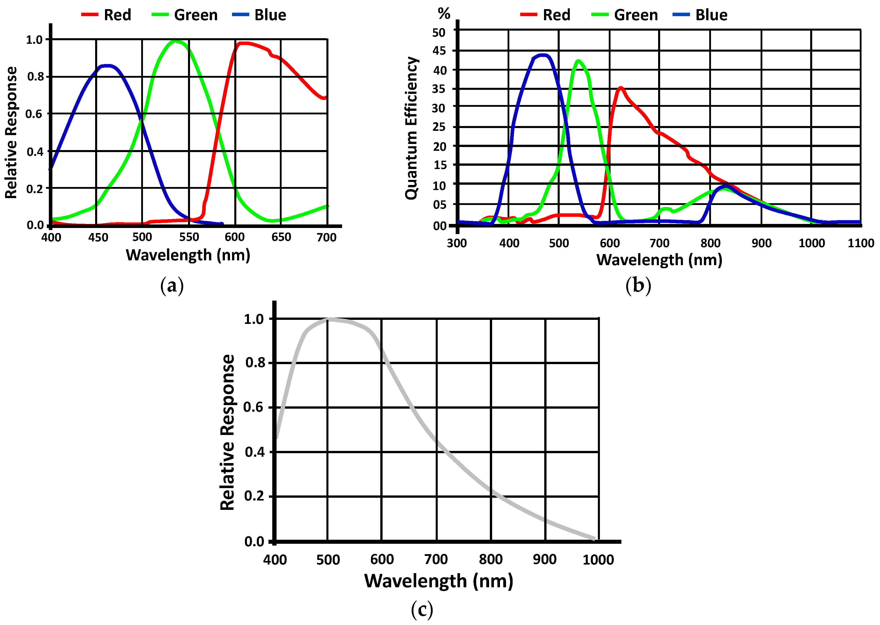 Generic spectral responses: (a) Relative Response (RR) for a RGB sensor; (b) Quantum Efficiency (QE) for a RGB sensor; (c) RR for a monochrome sensor.