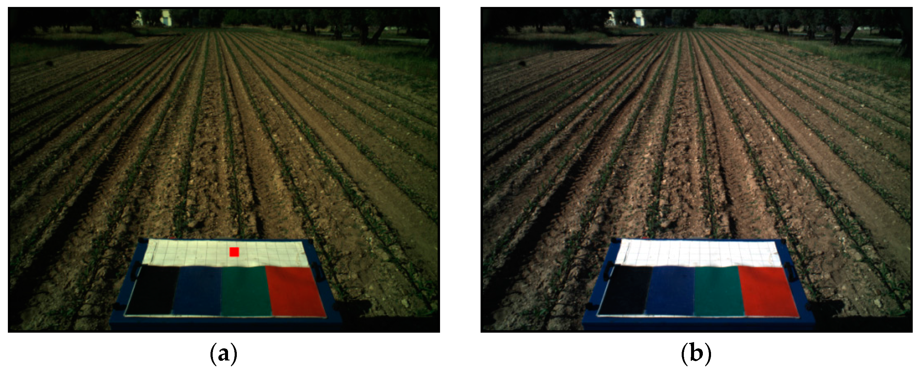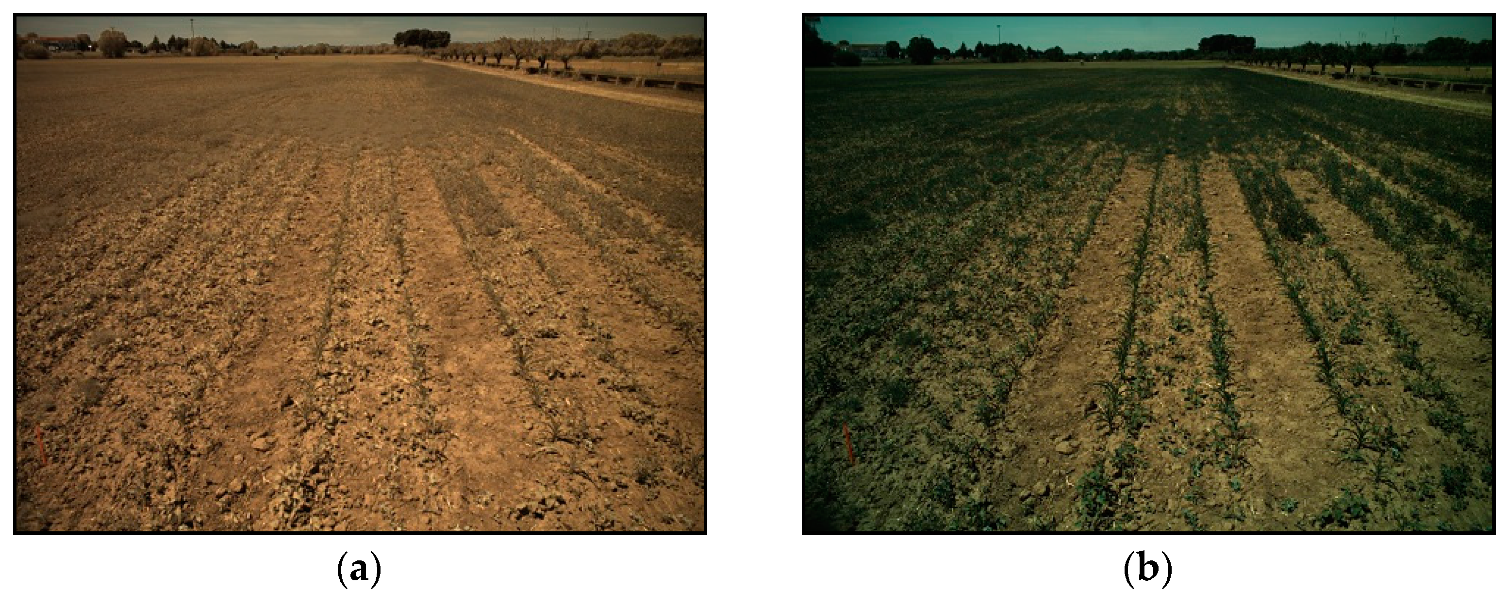 - Montalvo, M.; Guerrero, J.M.; Romeo, J.; Guijarro, M.; de la Cruz, J.M.; Pajares, G. Acquisition of Agronomic Images with Sufficient Quality by Automatic Exposure Time Control and Histogram MatchingLecture Notes in Computer Science. In Proceedings of the Advanced Concepts for Intelligent Vision Systems (ACIVS’13), Poznan, Poland, 28–31 October 2013; Volume 8192, pp. 37–48.