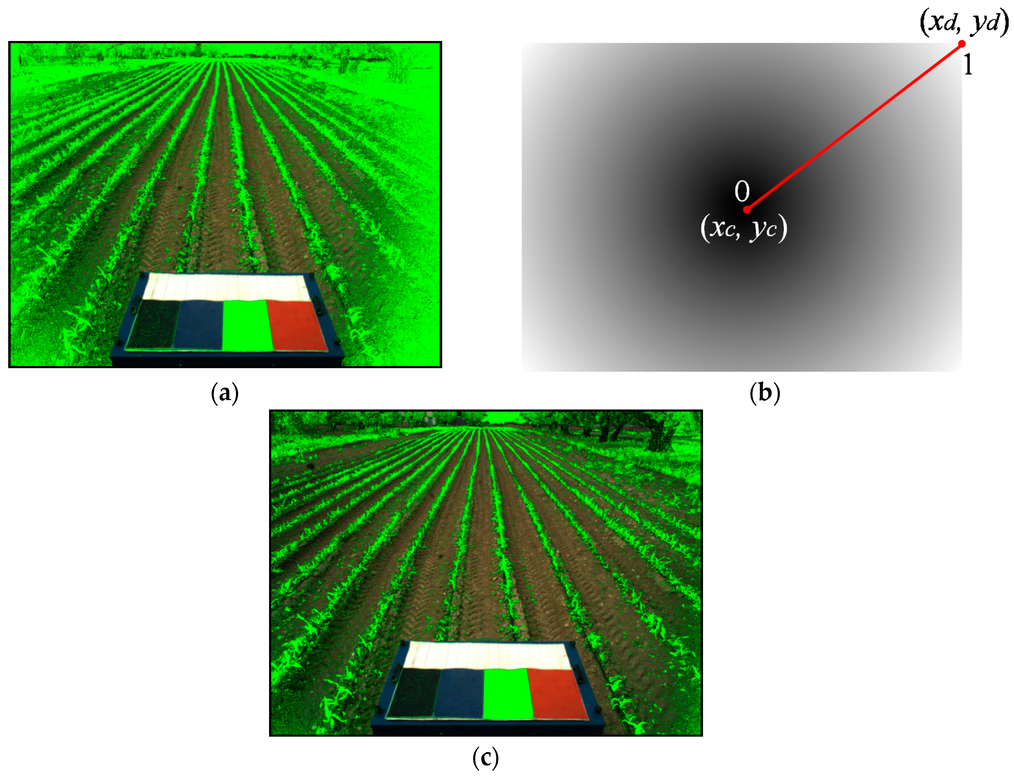 Despite the blocking filtering, a vignetting effect still remains, requiring correction. As specified by the manufacturer, the Schneider UV/IR 486 cut-off filter is based on what is known as thin-film technology containing more than thirty coats on one of its sides and a multi-resistant coating on the opposite one. The incidence angle of rays in the periphery of the filter is greater than in the center and they must travel longer distances along the different layers of interference. This effect is more pronounced the lower is the focal length of the lens, i.e., lenses with wide-angles. These cutting filters, particularly IR filters, are generally incorporated by the manufacturer on off-the-shelf digital cameras, because its selection for a specific agricultural application is unnecessary. The vignetting effect causes important anomalies on the spectral features. Indeed, because of the larger distances travelled by these rays, the IR wavelengths are filtered with higher intensity in areas far from the image center than in the central part of the image. By proximity of IR and Red (R) wavelengths in the spectrum, this last one is also affected with an excess of filtering at the expense of Green (G) and Blue (B) bands introducing an excess of G with respect to R, expressed with higher greenness at the external parts of the image and particularly at the corners. Figure 3a displays an image with greenness segmentation by applying the ExG index [8,11]. It is clear that an excess of green plants are segmented. Two approaches can be considered to correct this undesired effect. The first consists on the installation of UV/IR cutting filters just in front of the sensor (CCD, CMOS), with the aim of minimizing the distances traveled by the rays. As mentioned before, in off-the-shelf digital cameras this filter is built-in at the factory and most of the time no additional actions are required. In the second approach, when the first fails or it is not possible, specific spectral bands (R,G and B) corrections are required via software. For each pixel (x,y) a normalized distance ranging in [0,1] is computed as follows,