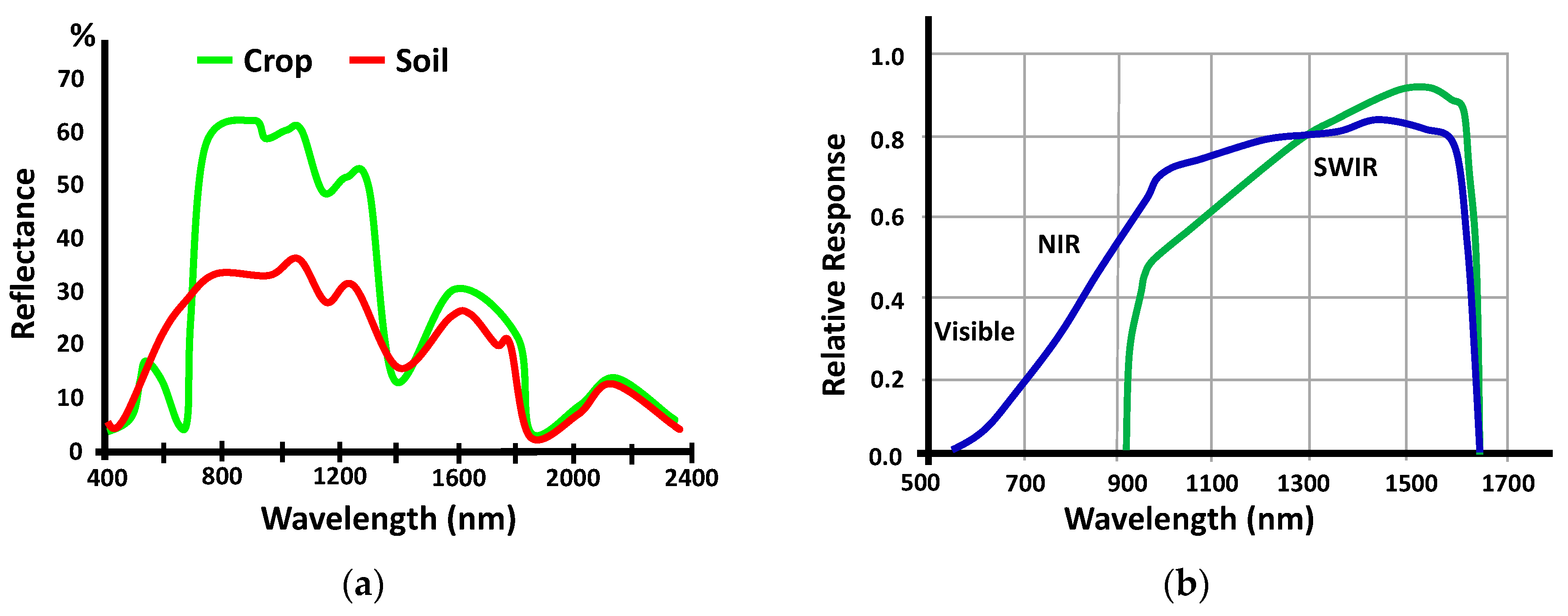 (a) Typical spectral reflectance profiles for crops and soil roughly drawn from the information provided in [34]; (b) Relative response from two generic sensors covering Near-Infrared (NIR) and Short-Wave infrared (SWIR) spectral ranges.