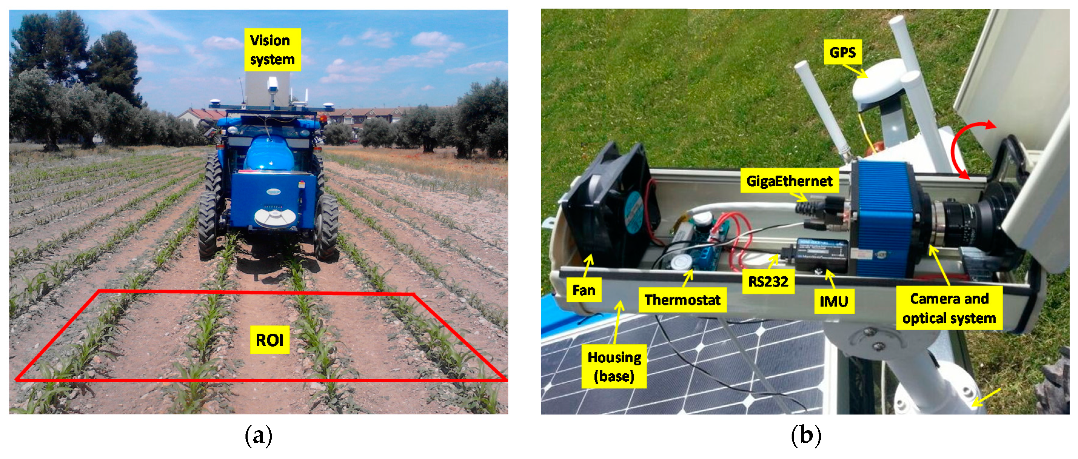 With progress, machine vision systems become imperative in autonomous vehicles and very useful for driver assistance in non-autonomous vehicles, considering that they work under adverse outdoor conditions from the point of view of image processing, required for such purposes. A review of control systems in autonomous vehicles was carried out in [1,2,3], where four subsystems were identified: guidance, weed detection, precision actuation and mapping. Imaging sensors were used for different tasks, including guidance, weed detection or phenotyping analysis. Crop rows detection and weeds identification are common tasks in precision agriculture where image processing techniques are used for site-specific treatments [4,5,6,7,8,9,10,11,12,13,14,15,16], guidance based on crop lines following [17,18,19,20], obstacle detection for security purposes [21,22,23,24,25] or mapping the environment in olive trees [26], among others. Recent technological advances have allowed the incorporation of vision systems onboard Unmanned Aerial Vehicles (UAVs), which can also be considered as agricultural vehicles, demanding priority attention [27].