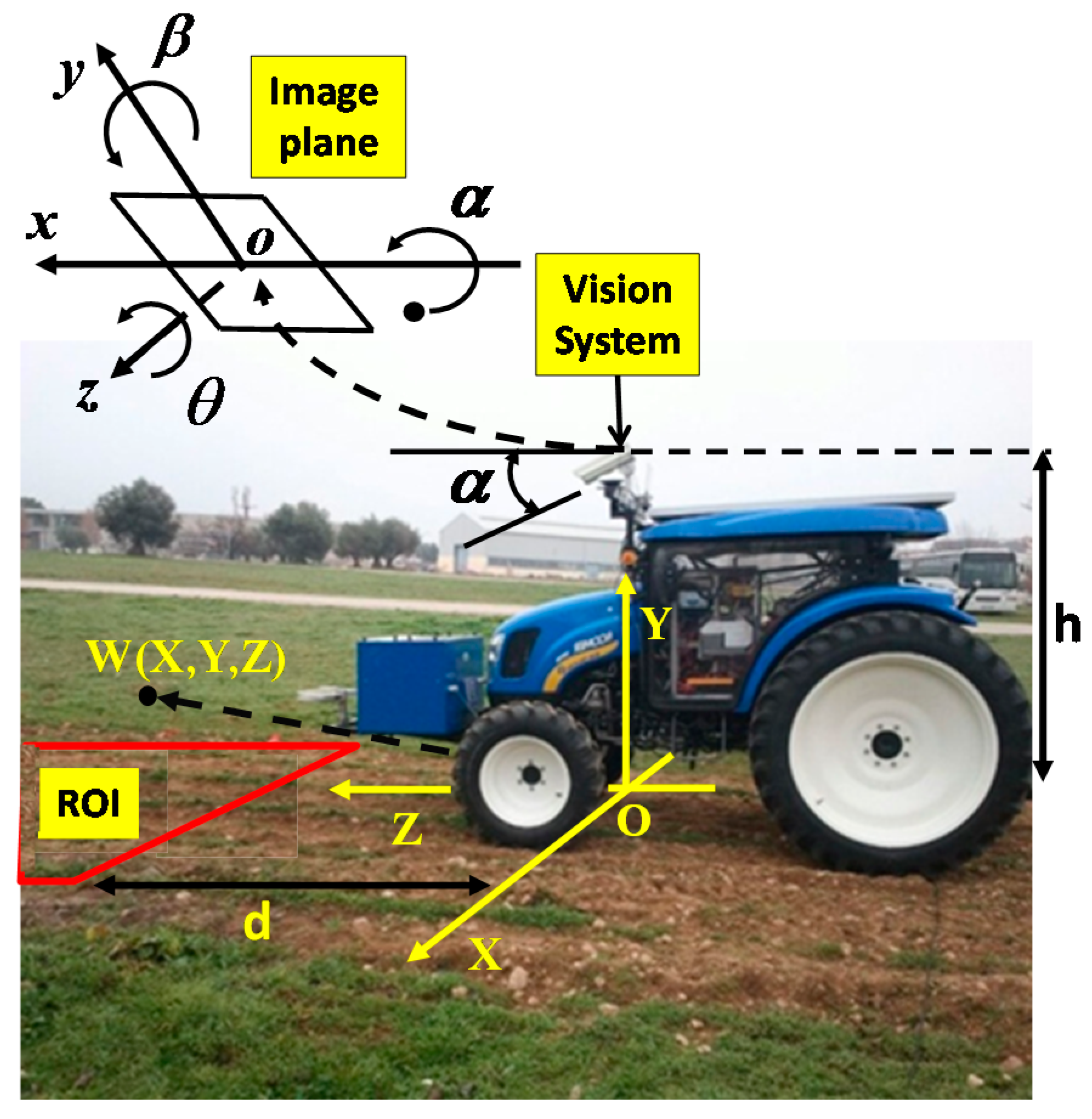 Once the above issues have been considered, the next action, oriented toward the visual system selection in agricultural applications, is the geometric system arrangement. The main goal in this regard consists of determining the vision system pose, particularly onboard autonomous ground vehicles, where a set of specific 3D extrinsic parameters, involving translation and rotation matrices, are critical. These parameters combined with the also critical intrinsic parameters (focal length, sensor dimensions) allow us to determine how the 3D scene in the field is to be projected on the image plane. This represents an important challenge; particularly during the vision system selection process. Indeed, there are several tasks with specific requirements. The following is a list of examples: