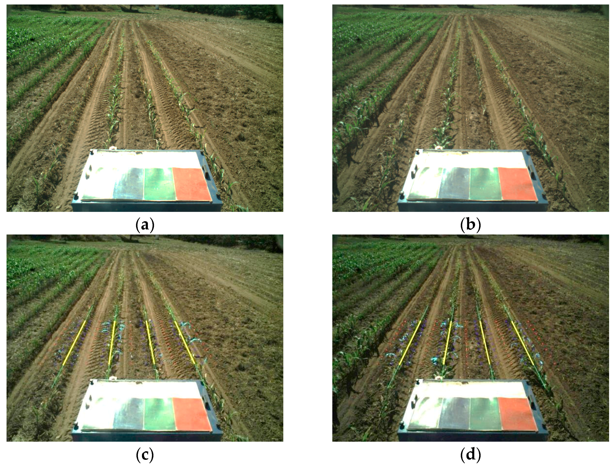 - Montalvo, M.; Pajares, G.; Guerrero, J.M.; Romeo, J.; Guijarro, M.; Ribeiro, A.; Ruz, J.J.; de la Cruz, J.M. Automatic detection of crop rows in maize fields with high weeds pressure. Exp. Syst. Appl. 2012, 39, 11889–11897. [Google Scholar] [CrossRef]