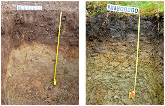 A total of 54 images were selected from the profile photographs taken during the NSIS2 (National Soil Inventory of Scotland 2007–2009) field campaign. The protocol for how these profiles was prepared and sampled is given in [24] and two examples of the imagery are given in Figure 2. The soil profile face was cleaned and photographed prior to sampling, and where possible the photograph was taken to clearly show the horizons and any important features of the soil. Clearly labelled signs with the Site ID (National Grid Intersect) were used in the photographs.