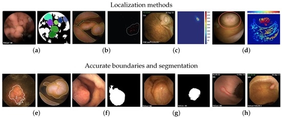 Figure 4 highlights some example images and results obtained with the aforementioned automatic polyp localization and segmentation methods. Note that, in localization approaches, though polyp bounding boxes or circles were obtained, no crisp boundary segmentations are available. Obtaining accurate boundaries and segmentations of polyps in a frame requires a robust method that can avoid the pitfalls of bubbles, trash, and illumination artifacts. Table 2 summarizes the methods available for polyp localization and segmentation so far. A preliminary mucosa segmentation [30,65,66,67] may be required before applying the polyp segmentation step in order to avoid these non-polyp pixels.