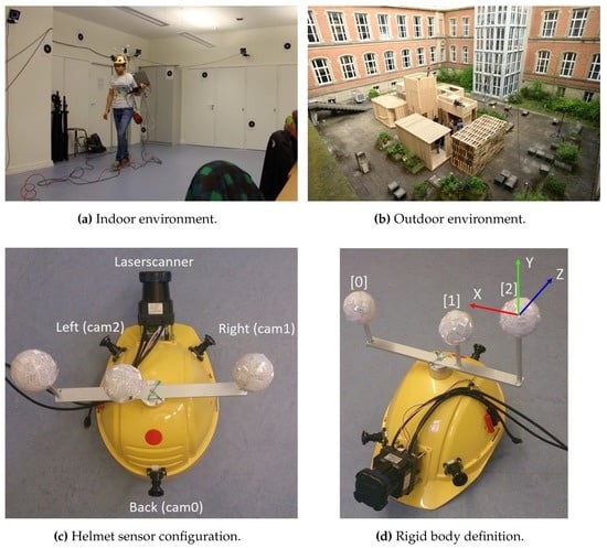 Depicted are the (a) indoor and (b) outdoor scenes. In (c,d) the helmet sensor configuration and the rigid body definition (colored coordinate frame) are pictured. The three reflective rigid body markers (spheres) are enumerated with [0],[1],[2].