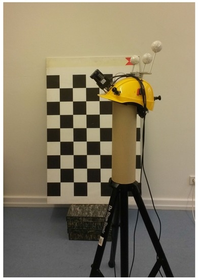 To acquire accurate 6 DoF ground truth for the motion of the multi-sensor helmet system, a motion capture system (OptiTrack (Corvallis, OR, USA), Prime 17W) with eight hardware-triggered high-speed cameras was used. The system needs to be calibrated in advance by waving a calibration stick with three passive spherical retro-reflective markers in the volume that the cameras observe. As the exact metric dimension of the calibration stick is known, the poses of all motion capture cameras can be recovered metrically.