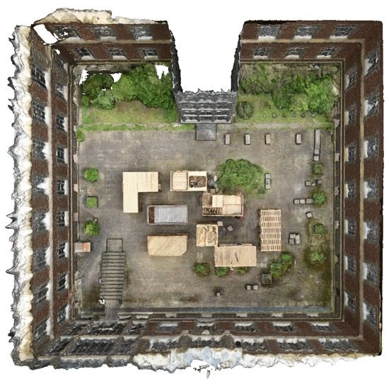 In addition, a textured 3D model of the outdoor scene is created, which can be used for comparison purposes or just to get an impression of the scene. Therefore, more than 500 high-resolution images are utilized. The images are captured using a NIKON (Tokyo, Japan) D810 equipped with a 20 mm fixed focus lens. The CMOS sensor has a resolution of approximately 36 Mpix. For processing the data to derive a textured 3D model, AgiSoft Photocan (St. Petersburg, Russia) software is used. A bird eye view of the 3D model is depicted in Figure 5.