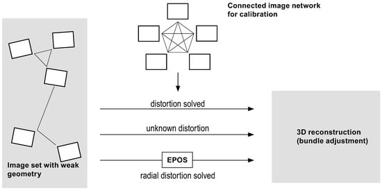 The proposed method, and its implementation EPOS, introduce a new automated ‘black-box’ paradigm in solving lens distortion for image sets with weak geometry, compared to the existing alternatives of either using a pre-calibrated camera (top arrow) or employing a non-linear distortion correction term inside bundle adjustment (middle arrow).