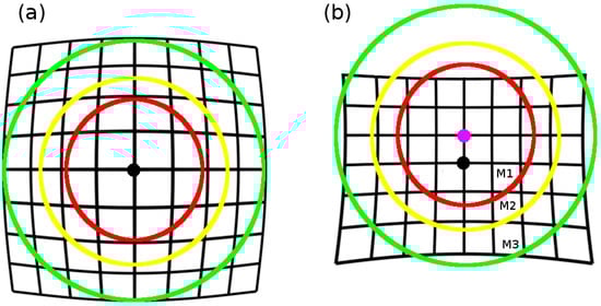 Illustrations of radial symmetry; see Equation (5). (a) Barrel distortion, ; (b) pincushion distortion with a (magenta) center of distortion different from the (black) center of the image. Symmetry is employed while solving the fundamental matrices and the radial correction parameter of Equation (9) consecutively. Here, each iteration increases the amount of inliers, , until the convergence of Equation (11) is reached, and is obtained.