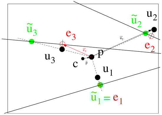 In Equation (6), denotes a unit vector, and is a vector from to point e that is the closest point of u on the epipolar line; see Figure 3.