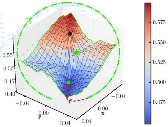 The orientation is solved first by looking for the bottom of the valley; see the green circular arrow shown in Figure 4. Specifically, a sufficiently large square of side length that can be said to capture all centers of distortions is drawn around the image center, and the symmetry measure of Equation (13) is computed on discrete points that reside at the perimeter and are spaced apart from each other (in units). In other words, solving the whole 2D landscape is not necessary, since we can only compute the 1D perimeter. After obtaining each , we calculate a weighted orientation vector