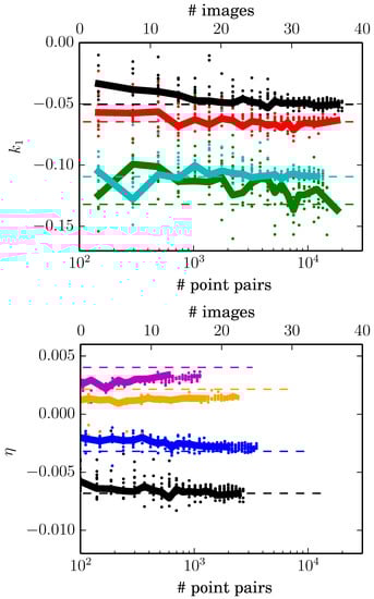 Here, the correction is applied to both (or all) images. However, due to the fact that the distortion on the other image was neglected before, the strength of the correction is prone to be underestimated. Because of this, when new fundamental matrices are obtained using corrected point pairs from Equation (10), the inlier mask computation may result in some of the inlier point pairs still being treated as outliers. Therefore, the process of solving new η and new needs to be repeated iteratively until convergence, which is reached when η is no longer underestimated. This, in turn, is seen from the fact that the amount of inliers in stops growing.