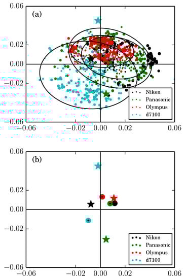 In Figure 6a, the results for the center of distortion are shown for various image block sizes. The size of the point represents the amount of data used to calculate that point. All samples are weighted with inlier percentages, and these weighted averages are shown in Figure 6b. Again, the amount of inliers for each result is determined by the convergence condition of Equation (11). The fact that the recovered center of distortion is different from the reference result is noteworthy and follows from that these center of distortions actually have different definitions (remember the work of []). Rigorously put in other words, the proposed r-symmetry center is to be used only for lens distortion correction and not for any 3D measurements done afterwards, for which the principal point is the correct choice.