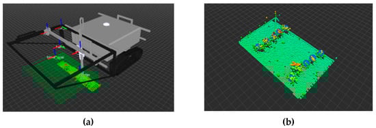 The resulting plant positions of the algorithm were compared with the ground truth to obtain the precision. The assembled point cloud and the detected plant positions could be visualized in real-time with the help of the ROS visualization tool “rviz” (see Figure 2b).
