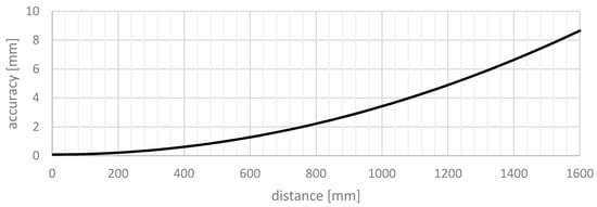 Development of the accuracy of a stereo vision system, with the assumed parameters B = 300 mm, f = 10 mm and p = 5 µm (see Equations (4) and (5)).