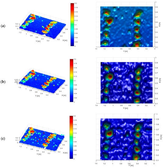 To increase the accuracy of the system and to minimize the influence of the accumulation of path errors (see Table 1), the sonar scans of the 3D frame were separated into 10 small segments of 10 cm × 140 cm. After each segment, the frame was driven to one end stop. The total time for each scan was 10 min. The unfiltered representation of the experimental area contained a total of 3801, 4383 and 4469 points for the three scans performed. After filtering the scan area to one point for each grid of 2 cm × 2 cm, the resulting points for the three scans were 2931, 2906 and 2907 points. The results of the point clouds are shown in Figure 4. Only points in the x-axis and y-axis greater than 0.1 m were considered. The 3D point representation is shown on the left side. The right picture depicts the same data as the surface reconstruction. The value of every grid was extrapolated by smoothing the values with the given point cloud dataset using a Delaunay triangulation principle with the use of the Matlab function gridfit [45]. The showed graphs were solved by setting a grid size of 1 cm over the considered area, defining a smoothing factor of 2 for the dataset.
