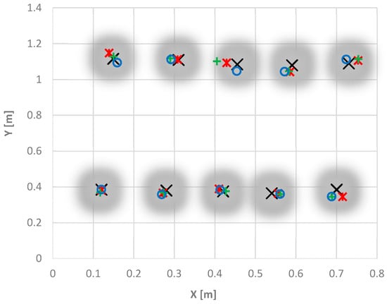 The experiment was realized at the University of Hohenheim (Stuttgart, Germany) and used artificial crop plants with a height of 20 cm. To simulate the spatial separation of corn crops, the positions of the plants consisted of 2 crop rows with 5 plants each, following the seeding density for maize used by [42], with 0.75 m between each row and 0.14 m between plants. The ground truth position of each plant was measured using a pendulum attached to the TCP that was moved over the top of the plants. The software based TCP position was saved as a plant reference. Only the (x, y) coordinates were considered (see Figure 1).