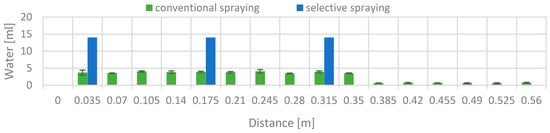 The standard deviations of the measured liquid content of the performed experiments were between 0.754 and 0.042 mL. The selective method applied all water spray precisely on the single plants, without any loss in the canisters of 3.5 cm diameter. The results of the continuous spraying showed a constant distribution over the measured area. The water distribution showed a continuous application of approximately 4 mL in the first 0.35 m of the path. However, the value was decreased to values close to 0.8 mL the rest of the way. This phenomenon was generated because the pump did not provide a continuous pressure or a shut off valve to keep the liquid inside the hose. In the selective application, no liquid was lost, as the TCP was not moving while the pump was working.