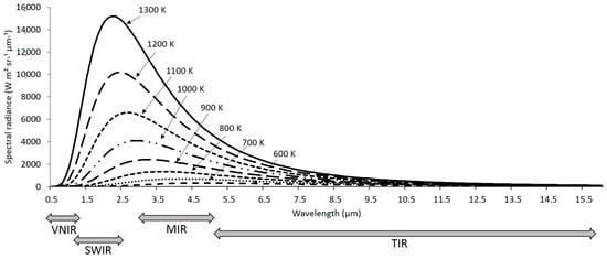 Figure 1. Relationship between the spectral radiant emissions (in terms of quantity and wavelength) and temperature of the emitting surface, thus representing the Planck function and both the Stefan–Boltzmann and Wien displacement laws. Different portions of the infrared spectrum are also depicted (VNIR: visual and near infrared; SWIR: short-wave infrared; MIR: mid-infrared; TIR: thermal infrared).