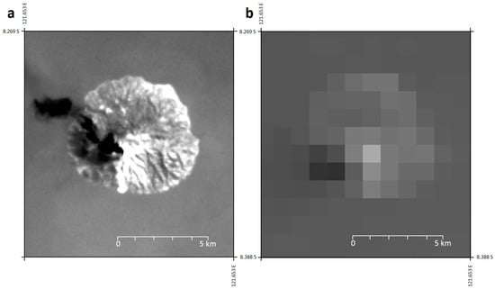 Figure 2. Infrared imagery of Palu’e Island, and Paluweh Volcano, Indonesia. (a) Landsat-8 infrared imagery, with a spatial resolution of 30 m, captured 0200 UTC on 29 April 2013; (b) MODIS infrared imagery (Calibrated Earth View data), with a spatial resolution of 1000 m, captured 0210 UTC on 30 April 2013. Note the greater level of detail discernible in (a) compared to (b).