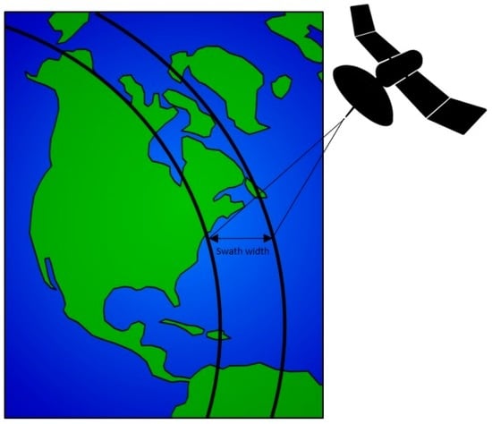 Temporal resolution: The temporal resolution of remotely-sensed data refers to the regularity with which a point on the Earth’s surface can be imaged by a sensor, and this, as well as the spatial and temporal resolution of spaceborne remote sensing devices are, in practice, inversely related [25]. The reason for this is that the higher the spatial resolution of a sensor, the smaller its pixels and, therefore, the narrower its swath, where the swath is the width of the area on the Earth’s surface that a sensor scans on overpass (Figure 3). As a narrower swath views less of the Earth’s surface at any one time, it will image the entire surface of the Earth with less regularity, hence reducing the temporal resolution. The swath width of NASA’s OLI, for example, is 185 km, with a pixel size of 30 m, resulting in a temporal resolution, otherwise termed revisit frequency, of 16 days (i.e., it will view the same point on the Earth’s surface, such as a volcano, once every 16 days); NASA’s MODIS, in contrast, has a swath width of 2330 km and pixel size of 1 km, resulting in a twice-daily temporal resolution. A reduced temporal resolution is sub-optimal if instantaneous reports of volcanic activity are required (for this, geostationary satellites may be used), but is often adequate for determining trends in volcanic activity over time.