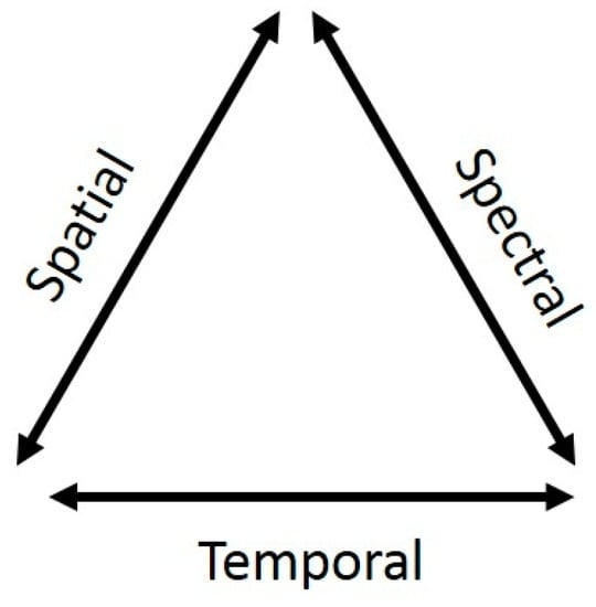 Figure 4. The trade-off between spatial, spectral and temporal resolution for Earth observation imagery. These relationships are a function of data transfer bandwidths; assuming a fixed bandwidth, a sensor possessing a high spectral resolution will need to compromise on either spatial or temporal resolution, and so on.