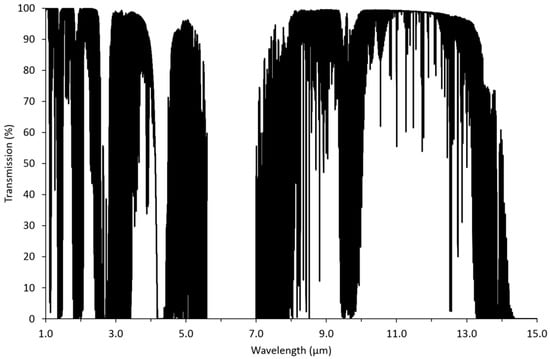 Figure 5. Atmospheric transmissivity in the infrared region of the spectrum. Note the limited transmissivity around 6.0 µm, attributable to absorption by water vapour. These data are based on a ‘standard atmosphere’. Source: [30].