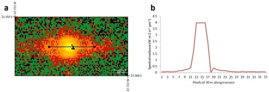 Figure 6. (a) Band 9 ASTER (SWIR) nighttime image of Lascar Volcano, Chile, with a transect through the radiant signal; (b) quantification of the signal along the transect in (a). Note that between Pixels 12 and 16, the signal plateaus, indicating saturation. At Pixel 18, the signal is 0 W m2 sr−1 µm−1, suggesting it has been temporarily disabled because of saturation in adjacent pixels.