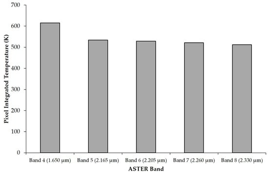 One issue that had to be dealt with from the outset of the discipline was that volcanic surfaces may vary by several-hundred degrees over just a few centimetres [92], and given that 30 m (and often cruder) has been the highest spatial resolution of data available in the infrared, techniques were required to ensure that the data obtained were as accurate as possible. Take a 30-m ASTER or Landsat-8 SWIR pixel for example: the situation on the ground could feasibly match the simulated pixel area of Figure 7, consisting of two (or more) surfaces of different temperature (and consider the possibilities within the 1000 m × 1000 m pixels of AVHRR or MODIS). As such, while radiance detected within one pixel might give an approximate indication of activity on the ground, such a pixel integrated value also hides much information. Given the varying sensitivity of different bands to surfaces of different temperature, any pixel integrated value detected will also be dependent on the band used to image it. For example, again taking the pixel modelled in Figure 7, if viewed in ASTER’s SWIR Band 4, the radiance temperature detected would be 615 K, as compared with 505 K if imaged with ASTER’s Band 9 (see Figure 8). This varying sensitivity is further demonstrated by the wider area of detection in Figure 9 where the Bands 4 and 9 signal detections are compared for the same volcanic surface.