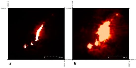 The significance of the requirement for larger infrared-imaging pixels is that the area imaged by one MODIS TIR pixel, for example, is rather large (1000 m × 1000 m), and when imaging an active lava-flow, such a pixel will detect radiance from various surface components (i.e., hot-incandescent and cooling lava-flows and even non-volcanic surfaces). As the radiance detected within one pixel is an average of the whole area imaged, with signals from sub-pixel components combined into a one ‘pixel-integrated’ value [24], the higher the spatial resolution of a sensor (i.e., the smaller the pixel size), the greater the level of accuracy and detail that will be discernible (see Figure 2). In providing a greater level of detail, smaller pixels image a smaller area of Earth’s surface, but this has a downside: that any hot surface imaged will constitute a greater proportion of a small pixel’s field of view, therefore increasing the possibility of saturation. As such, despite the added detail provided by higher resolution infrared sensors, those of coarser resolution (e.g., 1000 m) remain useful in the remote monitoring of the most radiant volcanic activity.