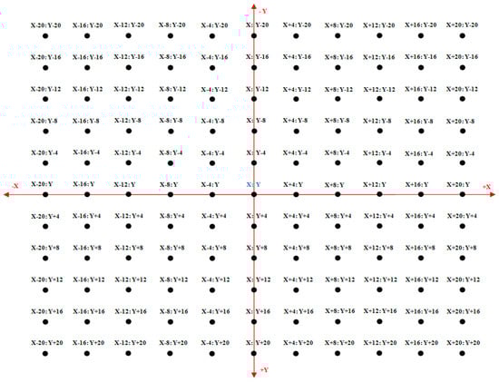 - As we have considered a maximum of 20 pixels’ movement of the tracked object in any direction from one frame to the next frame, therefore, 121 particles (each of size 100 × 100 pixels) around the location (X, Y) of the tracked object in last frame are considered to cover the complete region of 20 pixels’ movement in any direction. The location of each particle with respect to location (X, Y) of the tracked object in the previous frame is shown in Figure 1. For each particle, a 100 × 100 pixel image is extracted from the stored current frame based on the coordinate values shown in Figure 1.