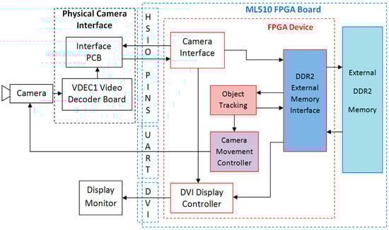 A simplified conceptual block diagram of the proposed and implemented FPGA-based real-time object tracking system using the Xilinx ML510 (Virtex-5 FX130T) FPGA platform (Xilinx, Inc., San Jose, CA, USA) is shown in Figure 2 to illustrate the data flow within the system. The main components of the complete FPGA-based standalone object tracking system are: analog camera, VDEC1 Video Decoder Board for analog to digital video conversion, custom-designed interface PCB, Xilinx ML510 (Virtex-5 FX130T) FPGA platform for performing real-time object tracking with automatic camera movement and a display device (display monitor).