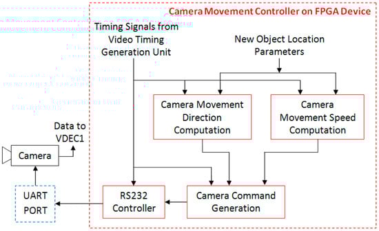 We have used the Sony EVI-D70P camera (Sony, Tokyo, Japan). This camera has pan, tilt and zoom features, and these must be controlled automatically based on the outputs from the object tracking module running on the FPGA. For this purpose, a dedicated camera movement controller has been designed. It takes inputs from the object tracking module running on FPGA and timing signals from the video timing generation block, generates the necessary commands for purposive movement of the camera based on the inputs received and sends these commands to the camera through the UART port available on the Xilinx ML510 (Virtex-5 FX130T) FPGA development board. It has four main modules as shown in Figure 3.