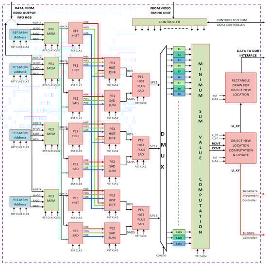 The VLSI architecture designed and implemented by us for the proposed particle filtering, color histogram and SAD-based object tracking scheme is shown in Figure 4. The input data to the object tracking architecture are coming from the DDR2 external memory interface. It is 48-bit data. As the DDR2 external memory interface performs two write/read operations in one clock cycle (one at the rising edge and the other at the falling edge), two pixel data become available in each clock cycle. One of the pixel data is 24 bits wide (eight bits each for the R, G and B color channels). The controller receives the control signals (video timing) from the camera interface module and generates the control signals for all the internal blocks of the object tracking architecture. These control signals ensure proper functioning and synchronization of all of the internal modules of the architecture.