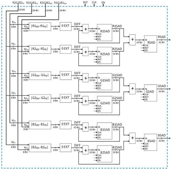 PEI-SAD (I from 1–3) module takes 48-bit data (two pixel RGB data in one clock cycle) from PEI-MEM (I from 1–3) and the corresponding 48-bit data from REF-MEM as two inputs in each clock cycle. It computes the SAD values for each color channel separately and finally adds them together to compute the sum of SAD values (SADS).