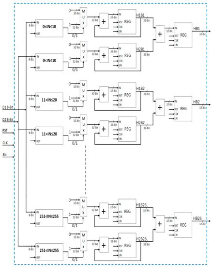 As two pixels are processed simultaneously, it takes 5000 clock cycles for computing histogram for the complete 100 × 100 pixel size image. At the end of 5000 clock cycles, there are two values for each bin of the histogram. Each bin value contains the histogram information of 5000 pixels. At the 5001st clock cycle, EN signals of the twenty six output registers are enabled. The sum of H1B1 and H2B1 is stored in the HB1 register; the sum of H1B2 and H2B2 is stored in the HB2 register; the sum of H1B3 and H2B3 is stored in the HB3 register; the sum of H1B4 and H2B4 is stored in the HB4 register, …, the sum of H1B25 and H2B25 is stored in the HB25 register; and the sum of H1B26 and H2B26 is stored in HB26 register. Each color channel histogram value produces twenty six bins as output. Each processing element histogram generation module produces 26 × 3 bin values as outputs, corresponding to the separate histograms of the three color channels for the 100 × 100 pixel size image.
