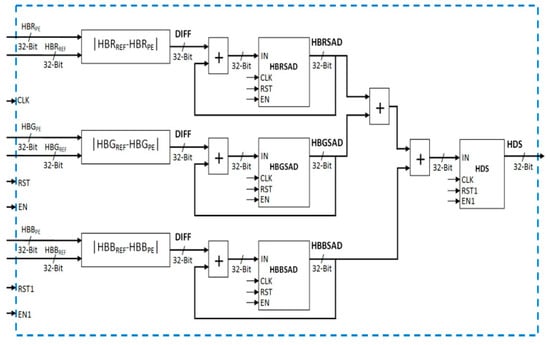 The outputs of each of the three processing element histogram units (26 × 3 bin values) along with the outputs of REF-HIST block are taken as inputs by the respective histogram differences sum computation modules (PE-HIST-DIFF ) for computing the sum of absolute difference values for histogram bin values (Figure 8). For this purpose, first, the difference between each bin of each color channel for each PEI-HIST (I from 1–3) module and the corresponding bins of REF-HIST module is computed. This is done in a sequential fashion. For each color channel, the PE bins and corresponding REF bins are considered one by one (one in each clock cycle). The absolute difference is computed between the PE bin and the corresponding REF bin. The computed absolute difference value is accumulated with the previous value for that particular color channel. It takes 26 clock cycles for computing the sum of absolute differences for histogram bin values for each color channel. The sums of absolute differences of histogram bin values for the three color channels are computed in parallel. In the 27th clock cycle, EN1 (enable) signal of the output register HDS is activated, and the sum of absolute differences of histogram bin values for the three color channels is stored. It takes 27 clock cycles for the completion of this task.