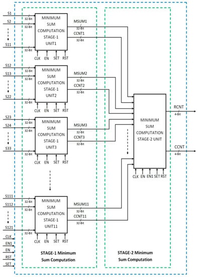 In this sub-section, the architectural proposal for finding the minimum sum among the 121 sum values stored in registers is described. The minimum sum is found in two stages (Figure 9).