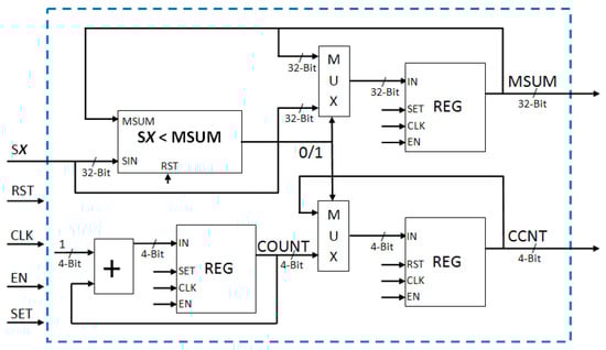 Internal architecture of minimum sum computation Stage-1 unit. SX → Sum Value of Xth Column in a Row; MSUM → Minimum Sum Value; CCNT → Column Counter; COUNT → Counter; MUX → Multiplexer; REG → Register.