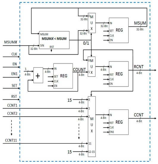 Figure 10 shows the proposed architecture for the minimum sum computation Stage-1 unit. It receives 11 sum values as inputs in a sequential order. At the beginning, the Minimum Sum Value (MSUM) is initialized to the highest 32-bit value. Each incoming sum value is compared with the previously stored Minimum Sum Value (MSUM). If it is less than the exiting MSUM value, then it is stored in MSUM, otherwise MSUM remains unaltered. It takes 11 clock cycles to find the minimum sum value among the 11 sum values of one row.