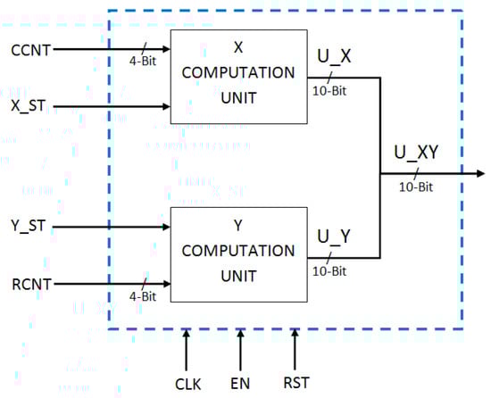 Block diagram of new location computation unit. CCNT → Column Counter; RCNT → Row Counter; X → X Coordinate Value; Y → Y Coordinate Value; X_ST → Previously Stored Value of X; Y_ST → Previously Stored Value of Y; U_X → Updated Value of X; U_Y → Updated Value of Y; U_XY → Updated X,Y Values;